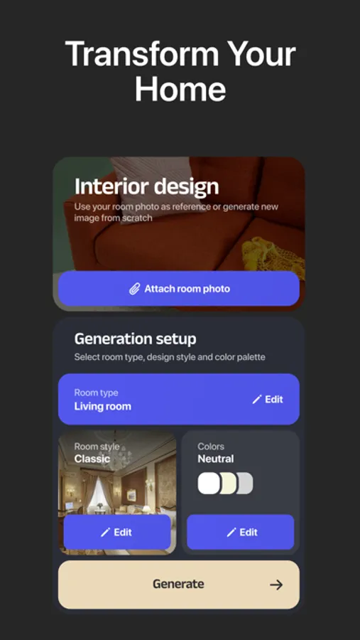 Our app is the ultimate tool for visualizing and exploring endless design possibilities. Whether you’re refreshing a single room or planning a full home makeover, our AI-driven features make the process smooth and inspiring.