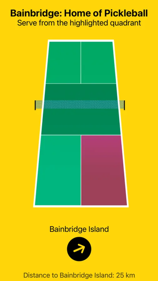Are you a pickleball player who sometimes struggles with deciding who serves first? This app is here to help! According to pickleball tradition, the first server is the player facing Bainbridge Island, Washington in the US — where pickleball was born in 1965. Let this app do the work for you by quickly determining the direction of Bainbridge Island from your location, so you can focus on enjoying the game. Happy dinking!