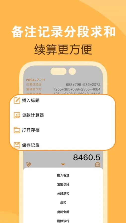 计算器 是一款超便捷、超好用的手机计算器软件。支持快速展示计算结果、备注记录、分段求和,实时查看计算过程、存档续算等等各种实用小功能。计算过程中,是否厌烦频繁点击等号来获得结果?是否大段计算中突然有点不确定刚才的输入是否有误,但又无法查看?是否计算过程中需要对某几行算式进行求和?是否出现还没算完但临时有事,咋办?