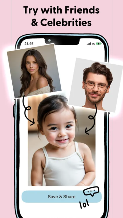 Our app analyzes both parents' features with advanced AI, creating a realistic image of your future child. Share the delightful results with your loved ones. Download AI Future Baby Generator today and take a glimpse into your future!
