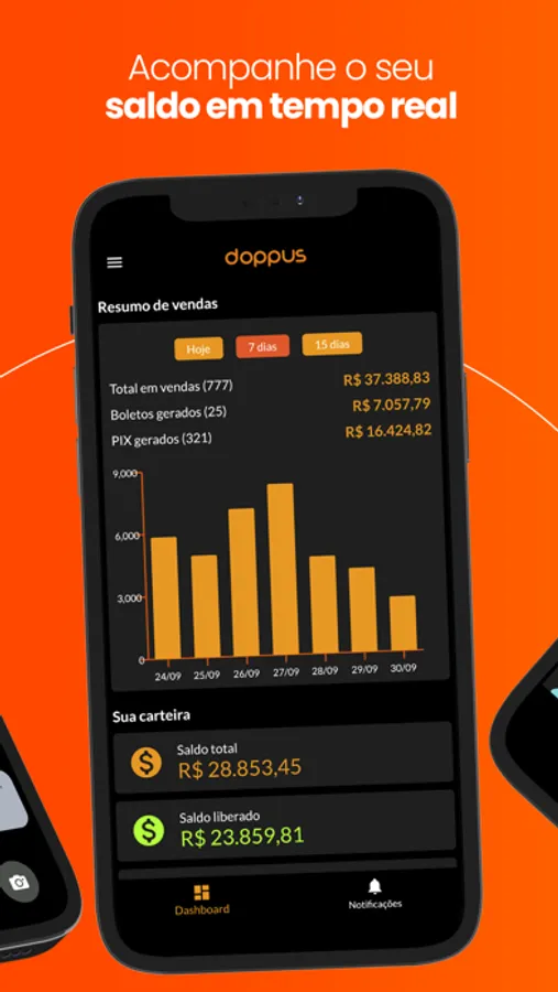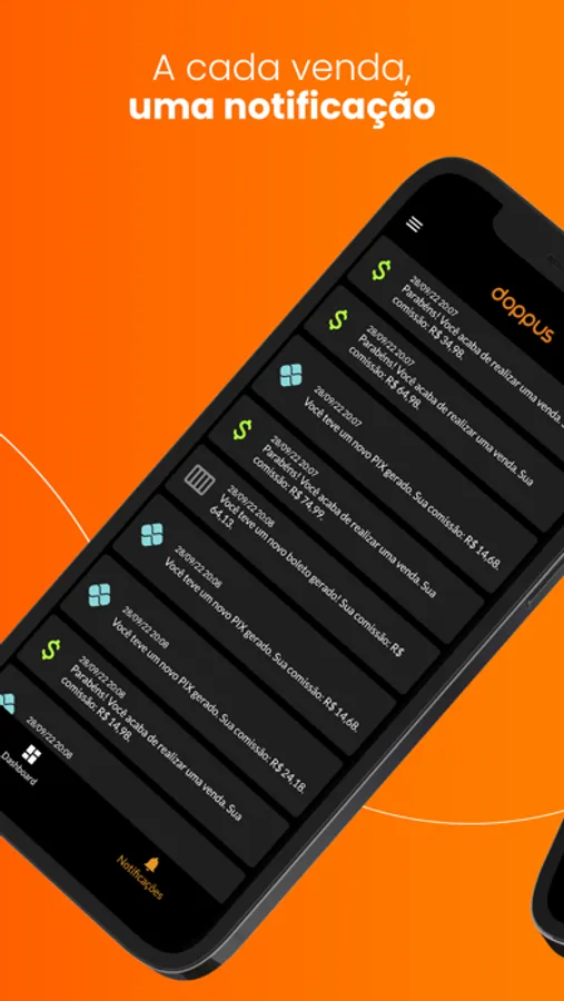 Aplicativo criado especialmente para quem vende na Doppus acompanhar seu saldo e receber as notificações de vendas realizadas, PIX e boletos gerados.