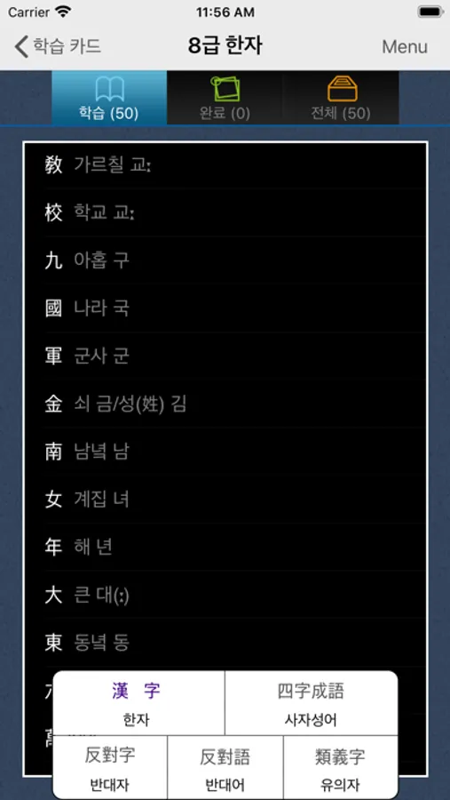 3. 학습을 완료한 한자의 경우, 학습 완료 폴더에서 별도 리스트를 확인할 수 있습니다.
