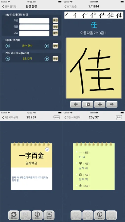 2. 플래시 카드에서는 Mode(자동 보기/수동 보기 선택), Add(My 카드 책갈피), info(활용어 정보 보기), view(한자 상세 내용 보기) 기능을 지원합니다.