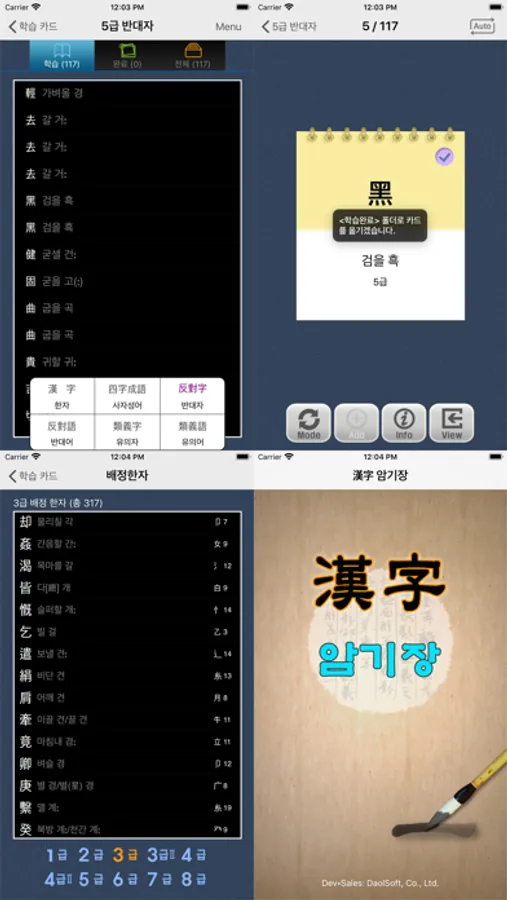 각 급수별 반대자, 반대어, 유의자, 유의어, 사자성어 학습을 모두 지원
