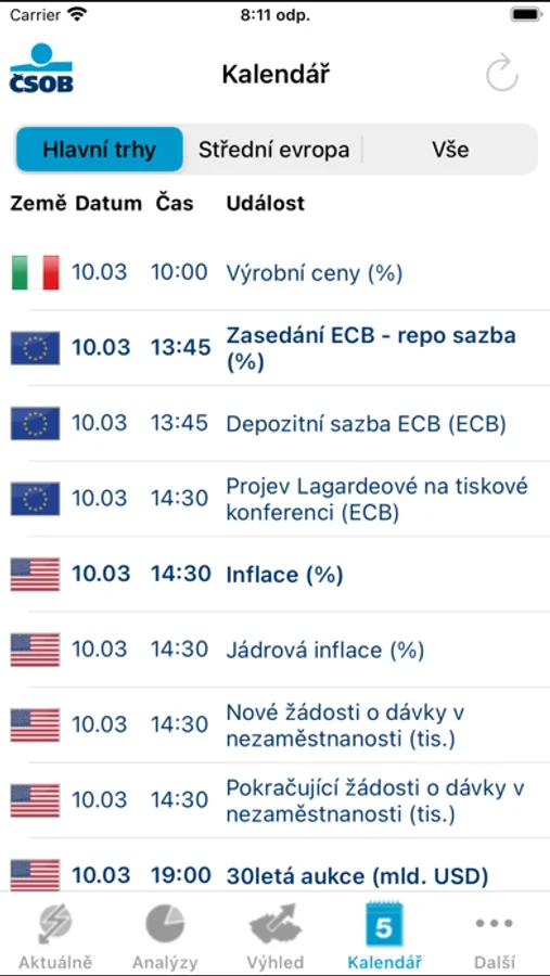 • kalendář očekávaných událostí pro hlavní trhy a střední Evropu;
