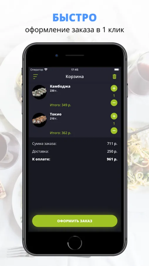 Скачивайте наше приложение, оформляйте заказ и наслаждайтесь любимой едой, где бы Вы ни были! Приятного аппетита!