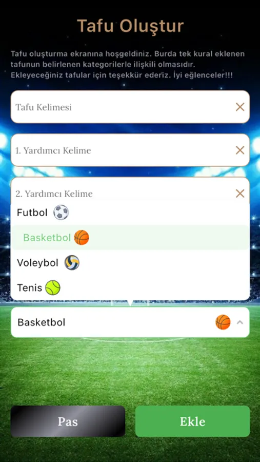 Spor tutkunları için özel olarak tasarlanmış nihai Tabu deneyimine hoş geldiniz! Uygulamamız, Tabu oyununu mobil cihazınıza getiriyor, hem de bir farkla—her kelime futbol, basketbol, voleybol ve tenis gibi en sevdiğiniz sporlarla ilgili!