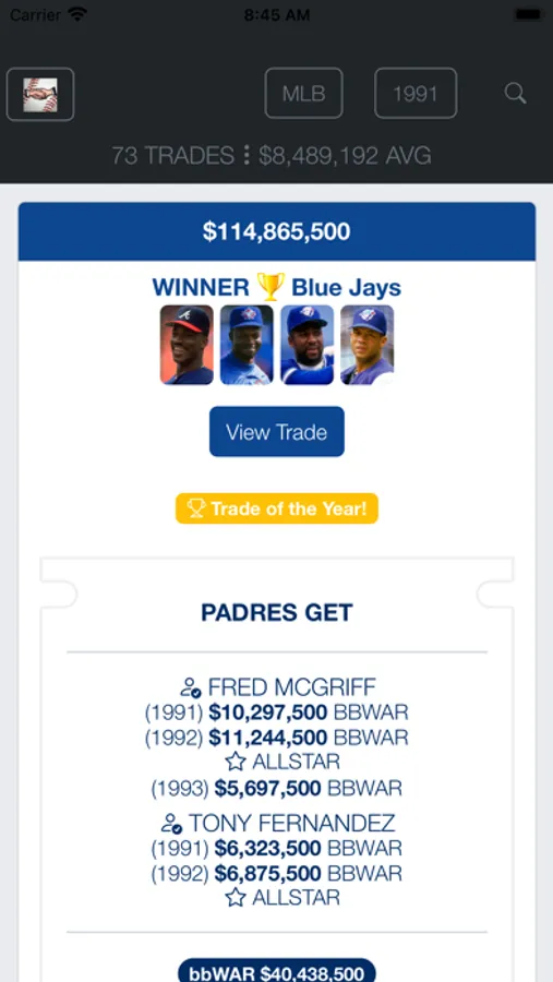 NOTE: Winners can change with each season since player bbWAR value can grow with each game played on the new club.