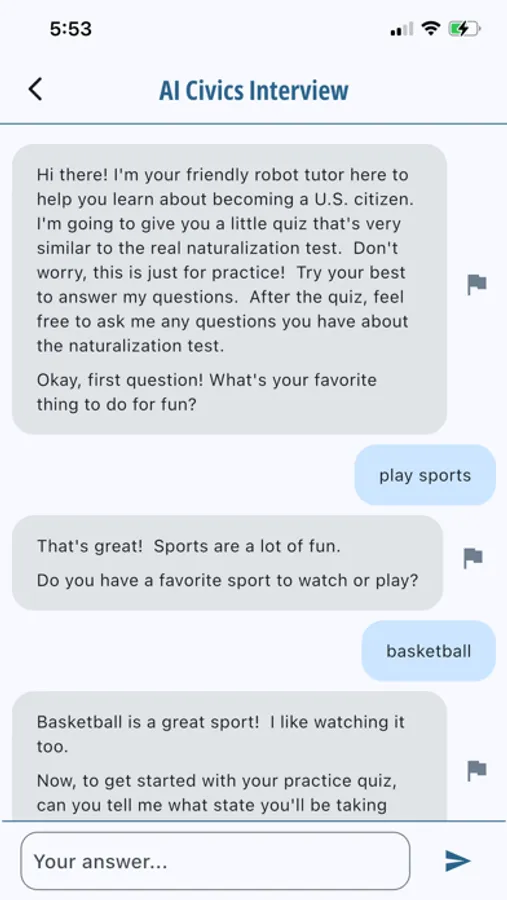 Engage in a conversational interview process that is similar to the real thing. Other apps or flashcards will help you feel what it will be like during the actual interview process as well as the Immigratus AI Civics Test application.