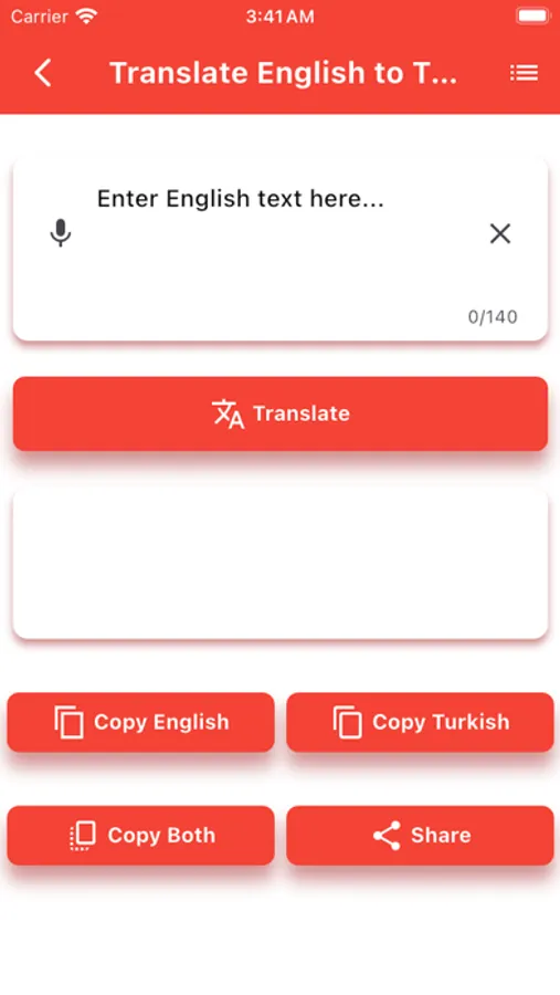 Voice and Text Translation: Translate anything from English to Turkish using voice or text input. Speak or type your sentence, and the app will provide an accurate Turkish translation. This feature adds convenience, enabling you to translate in real-time.