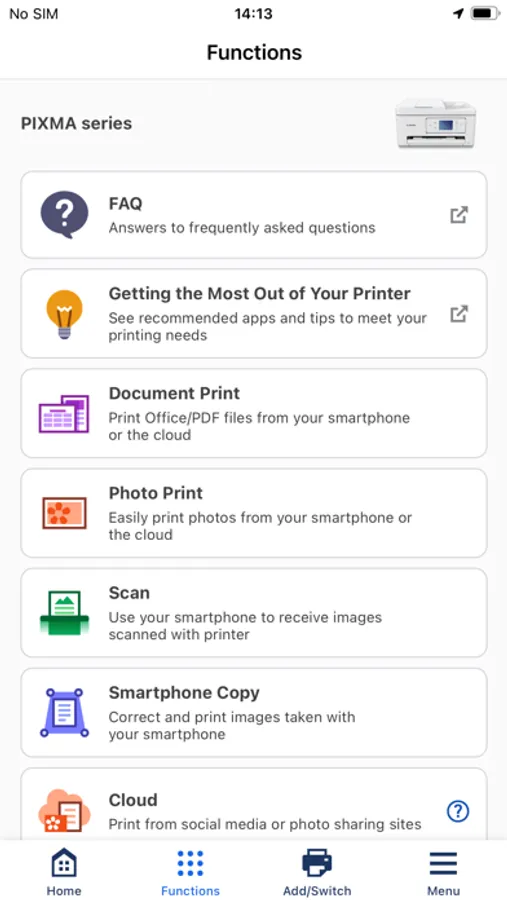 With this app you can set up your printer, and start printing and scanning. It also provides various handy functions such as checking consumable levels, and printing via the cloud.