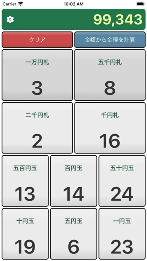 各金種の数量を入力して合計を求めたり、複数の金額を入力して、それぞれの金種がどれだけ必要かを簡単に計算することができます。