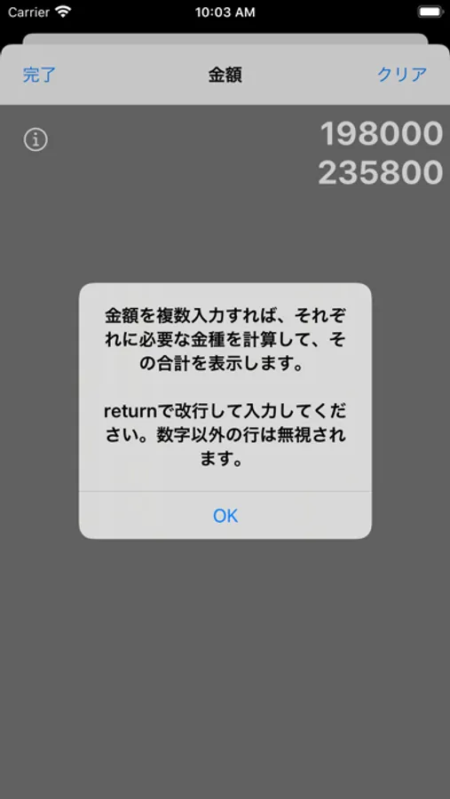 給与/バイト代等を支給する時に、複数の合計金額を入力すると、それぞれに支給するのに必要な金種を計算し、その合計を表示します。合計金額は他のアプリ等からコピー&ペーストして入力する事も可能です。