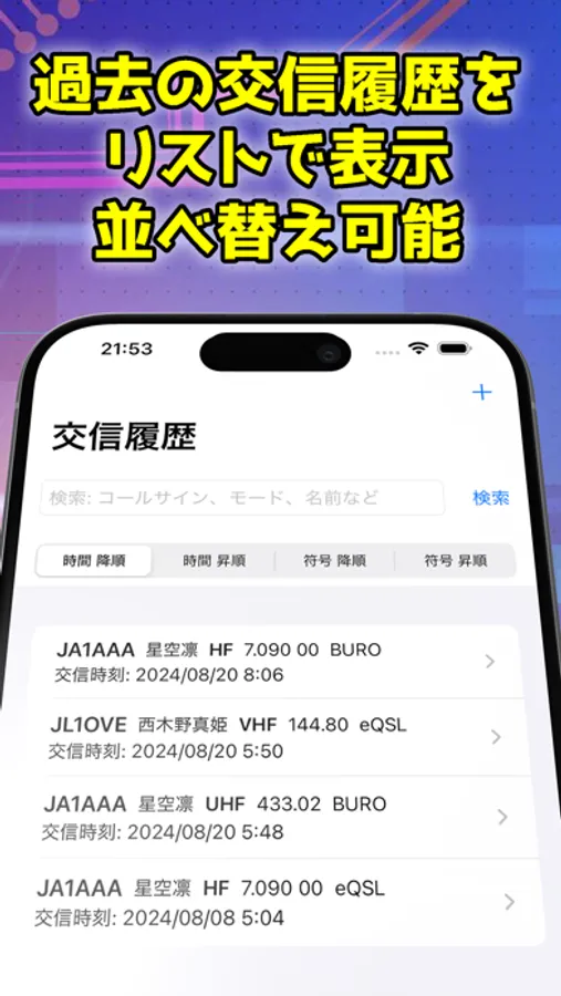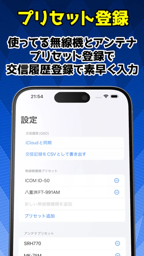 Organize and search QSO logs by date and callsign. With the preset feature, inputting information about your radio and antenna is a breeze.