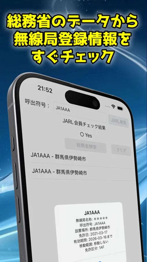 Effortlessly search for amateur radio stations in Japan and streamline your QSO log management with HAM Support, the all-in-one app for amateur radio operators. Instantly check JARL (Japan Amateur Radio League) membership status, QSL card transfer availability, and manage your QSO logs, radio, and antenna details—all within this app.
