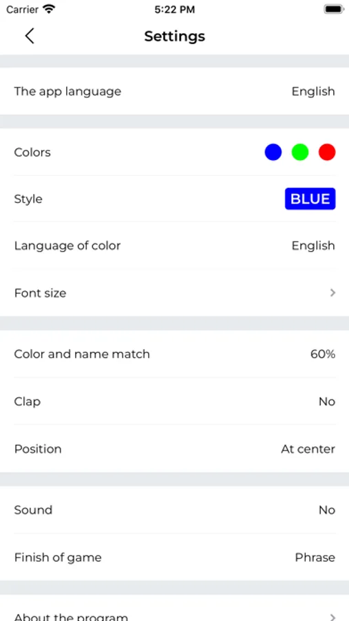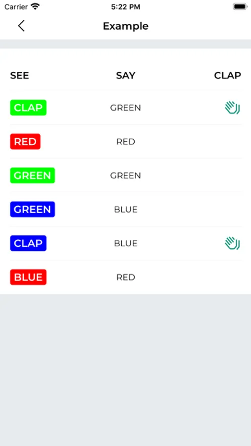On the screen you can see a word in any color with the name of a random color or the word “clap”. Sometimes the color name and the reflected color can coincide, sometimes not. You should say the color regardless of the written word. At the same time if the word “clap’ is shown you need to clap your hands.