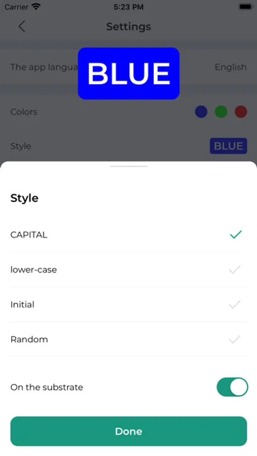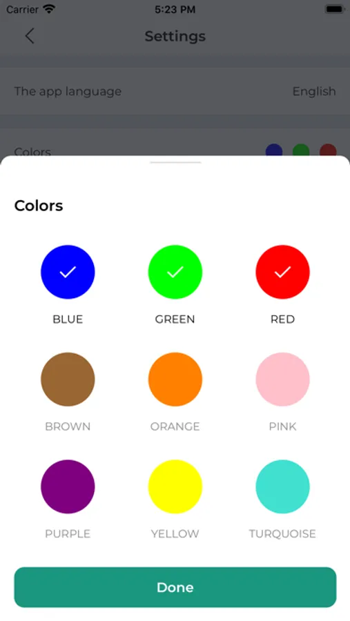 • 9 colors for the game: blue, green, red, brown, orange, pink, purple, yellow, turquoise.