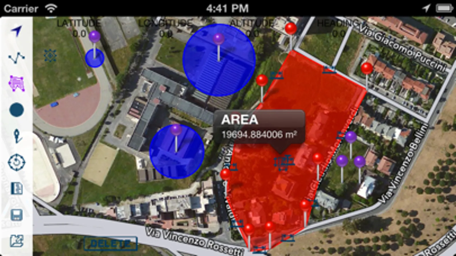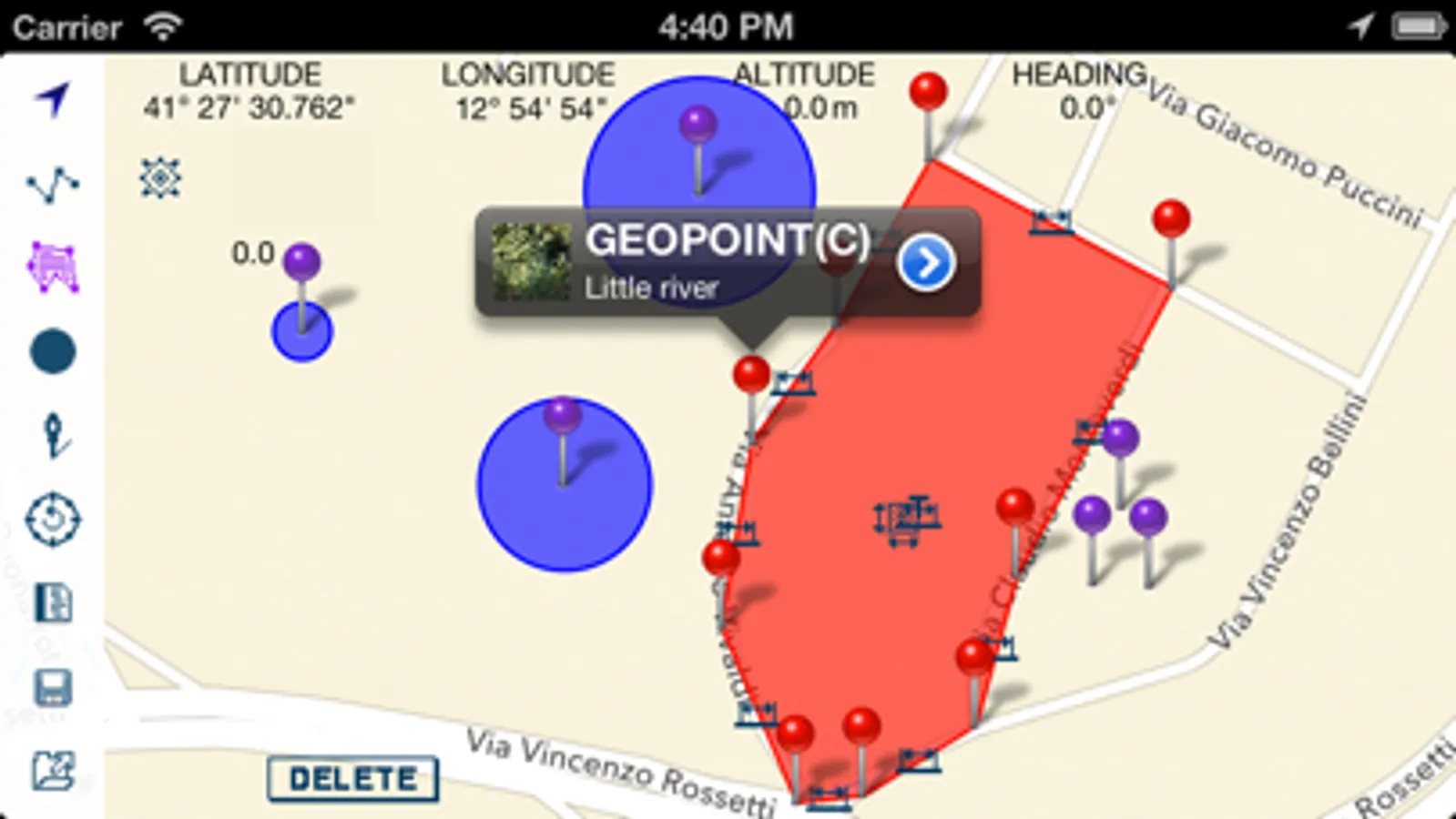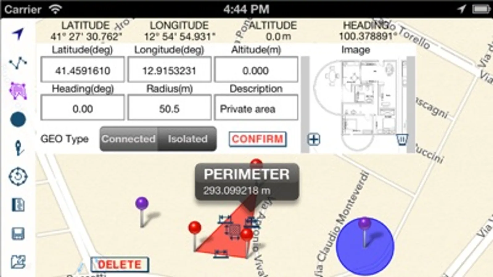 - enter manually new geographical points using the manual input window (with latitude, longitude, altitude, heading (it uses the device's internal compass), radius, description: these geopoint's data (such as latitude, longitude, altitude, heading, etc…) can be entered automatically by touching with a finger the desired position in the displayed maps (by touching the screen of the device) or manually typing the numerical values / text using the keyboard of the device)