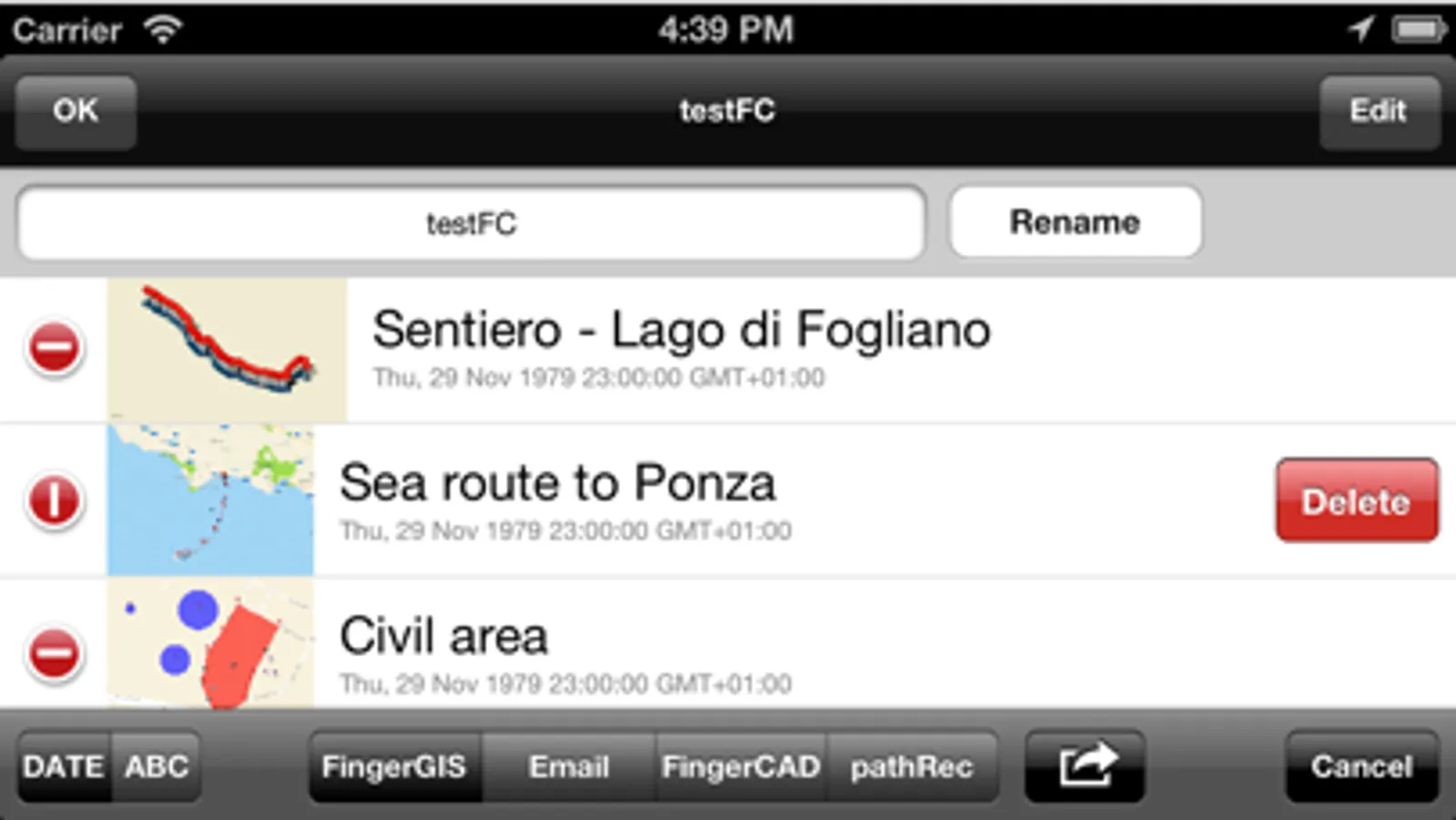 All geographic points inserted over the maps, with their descriptions, measurements and images can be saved in the archive of documents of "FingerGIS" and may be shared with other applications installed on Your device or with cloud systems such as Dropbox.
