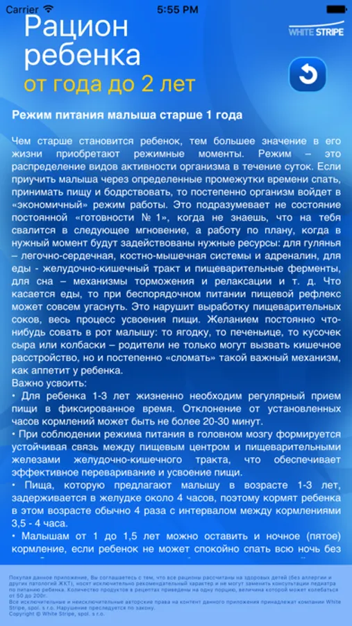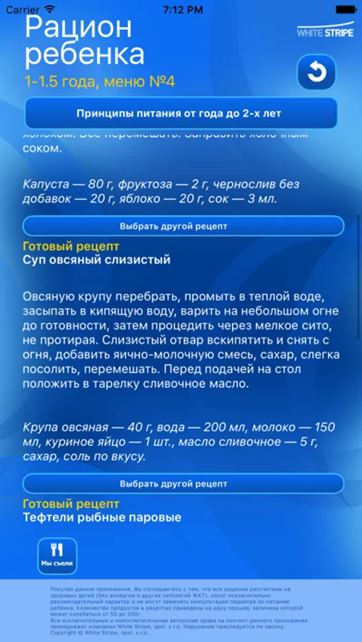 Имея приложение под рукой, Вы всегда без труда составите полноценный дневной рацион для своего ребенка. Вы можете воспользоваться уже готовым рационом, а можете, заменяя рецепты на другие, составить свой рацион, с учетом потребности именно Вашего ребенка. Все рецепты детских блюд имеют простой состав, поэтому приготовление не займет много времени.