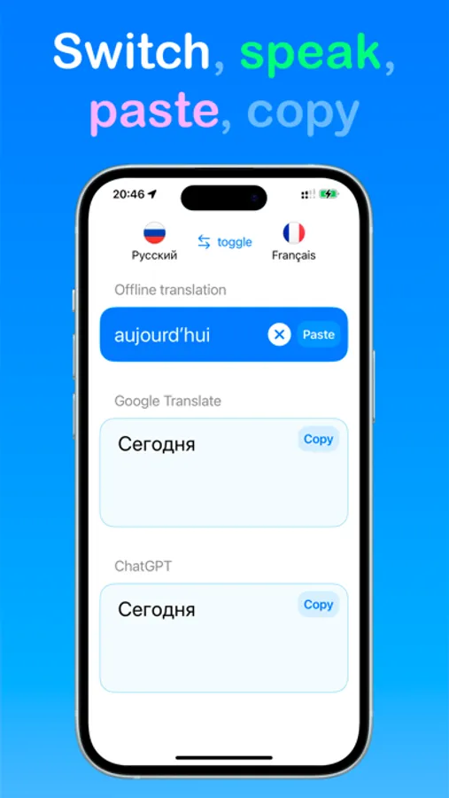 Translate words offline, without internet. Compare translations from Google Translate and ChatGPT to find the best fit for your needs (requires internet).