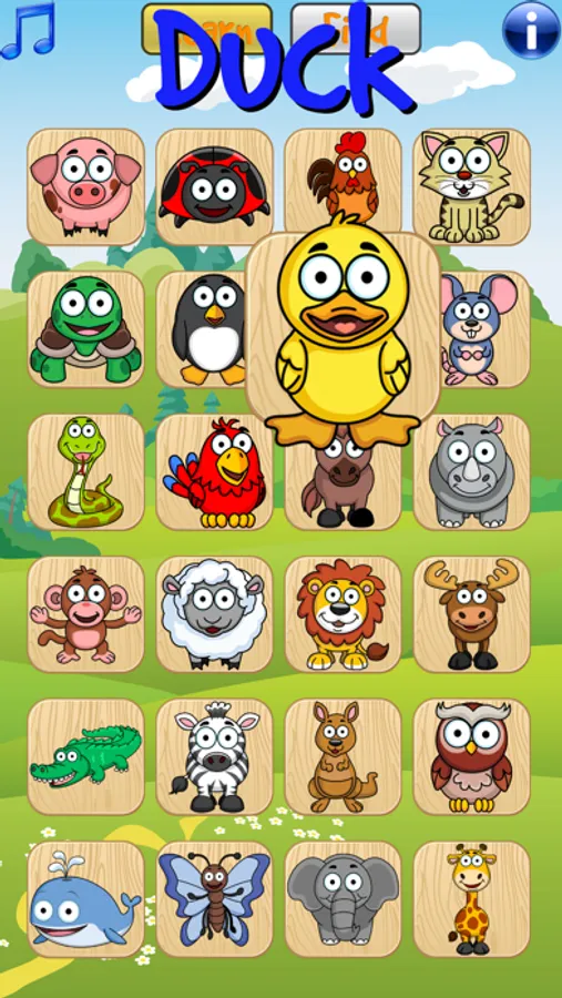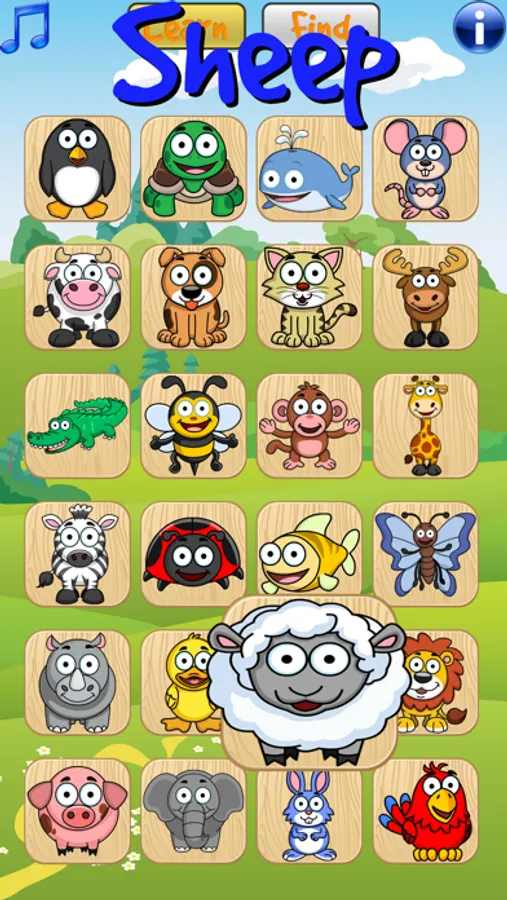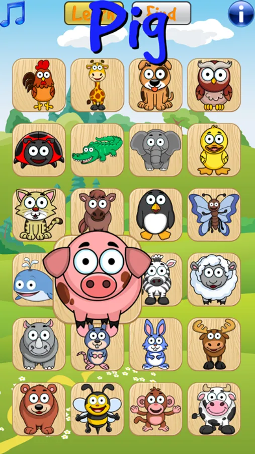 Learn: In this game mode, your child can tap on any animal tile to hear its name and animal sound. Find: In this game mode, your child is asked to find an animal by name and is given positive feedback when they succeed.