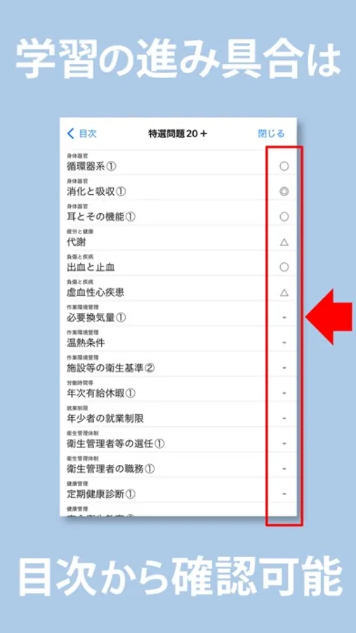 Additionally, results will be displayed on the table of contents. You will find your weak points at a glance. This feature support you to conquer your weakness. Let's get basic knowledge for the certification, and conquer your weak points with this application.