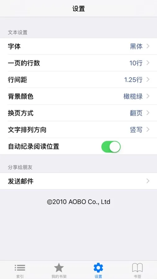 字体:宋体/黑体/楷体,每显示页的显示行数,行间距,页面的背景颜色,换页的方式:翻页/滑动换页,文字的排列方向:横排/竖排,是否进行自动纪录最后的阅读位置。