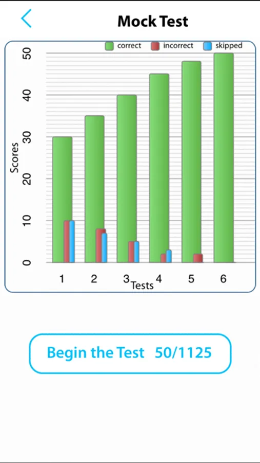 After you have practiced all types of questions, you can take a Mock Test with 50 questions. The Mock Test has questions selected randomly from each topic. Scores for the mock tests taken in the past are displayed in a bar chart. This is a great way to track how you are progressing in mock tests. There is no limit on how many mock tests you can take.