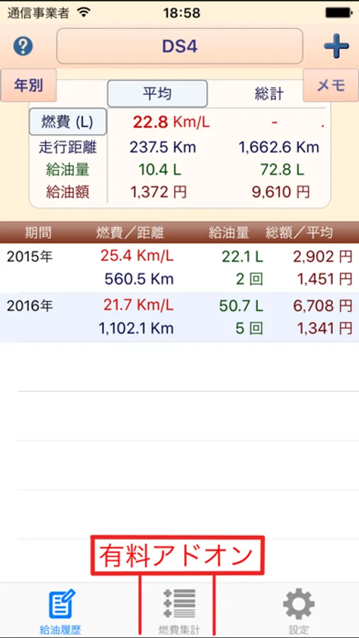 ・平均燃費[Km/L][Km/円]、総給油量/額。