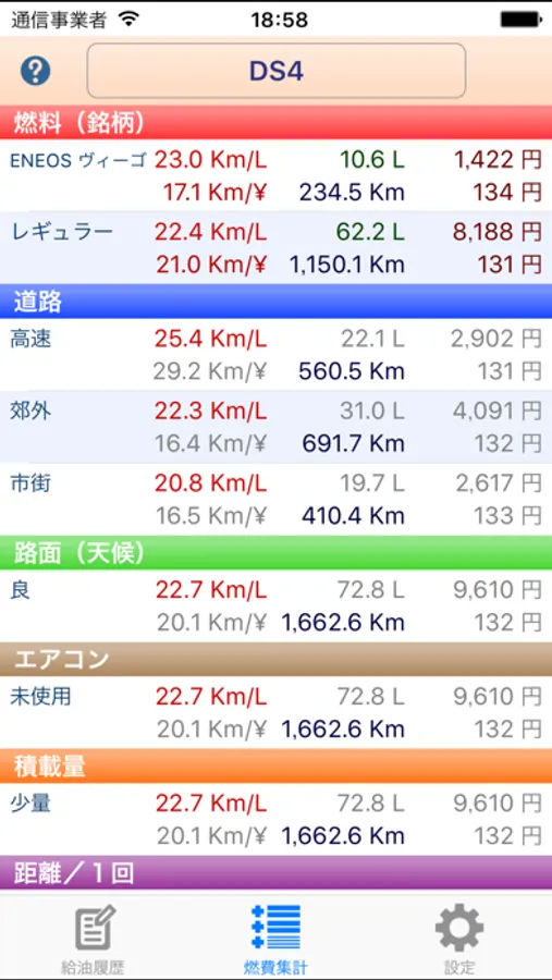 ・燃料、道路、天候、AC、積載 別の燃費集計