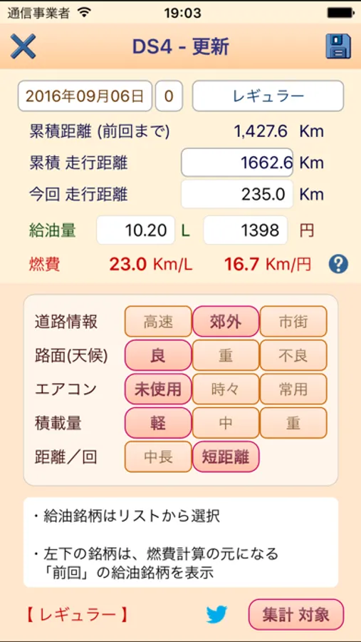 ※燃料や道路・天候・積載量別の集計は、給油タイミング毎の記録の為、精度は高くありません。