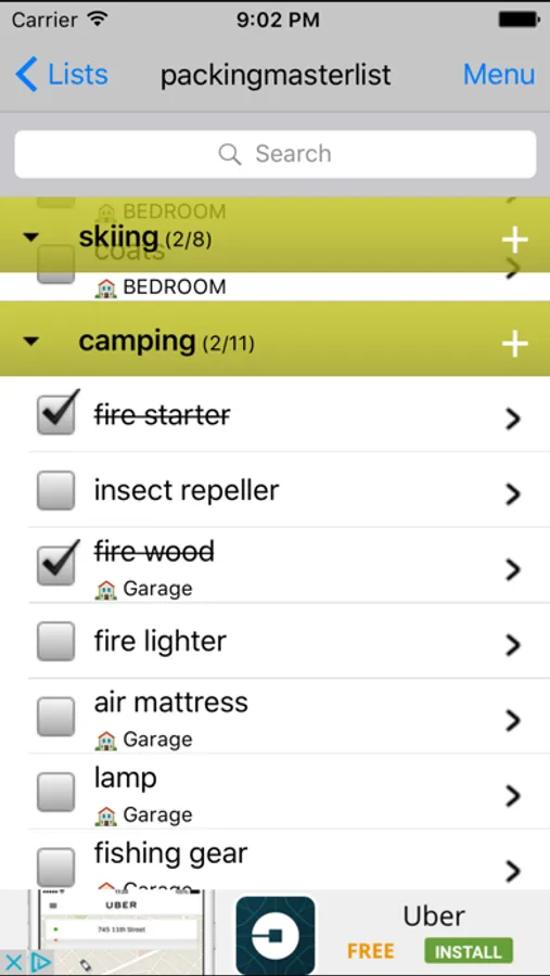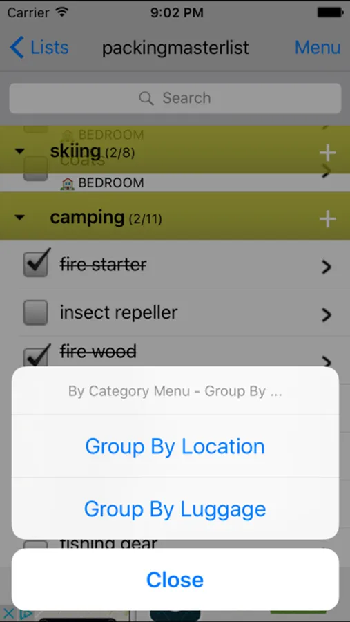 You can manipulate lists in views grouped by locations or luggage. Packing is to take items from location by location and distribute them to luggage. Grouping by location helps to organize your packing process. Unpacking is to bring items from luggage by luggage back to where they come from. Grouping by luggage helps you to track your unpacking process.