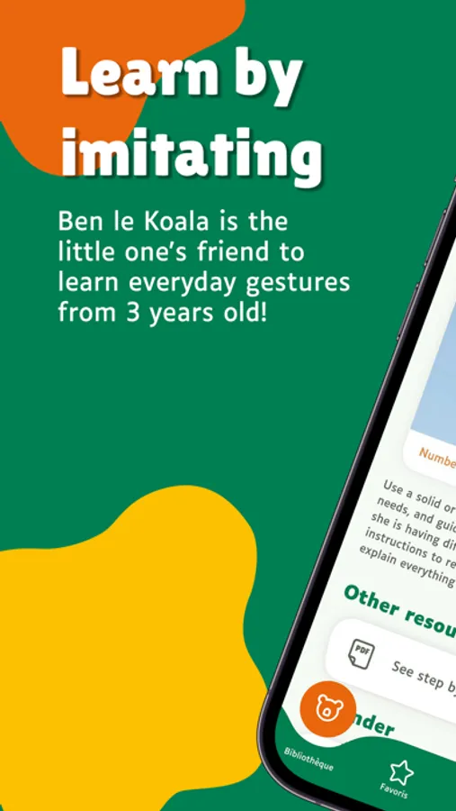 Ben le Koala, a fictional and animated character, helps little kids with and without disabilities in their daily lives. He makes gestures and the child learns by imitating him.