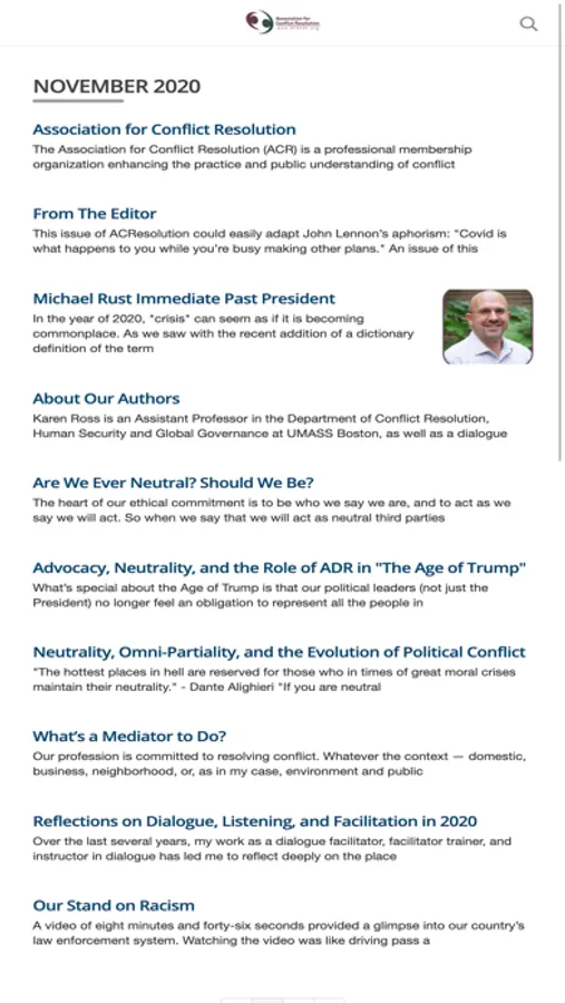 ACResolution is a quarterly magazine which, provides a source of leading edge articles in the field of conflict resolution. Each issue offers articles within a specific theme. ACResolution is published by the Association for Conflict Resolution (ACR), www.acrnet.org.