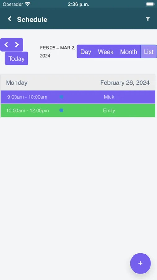 With status (Scheduled/Confirmed/Completed/Cancelled)