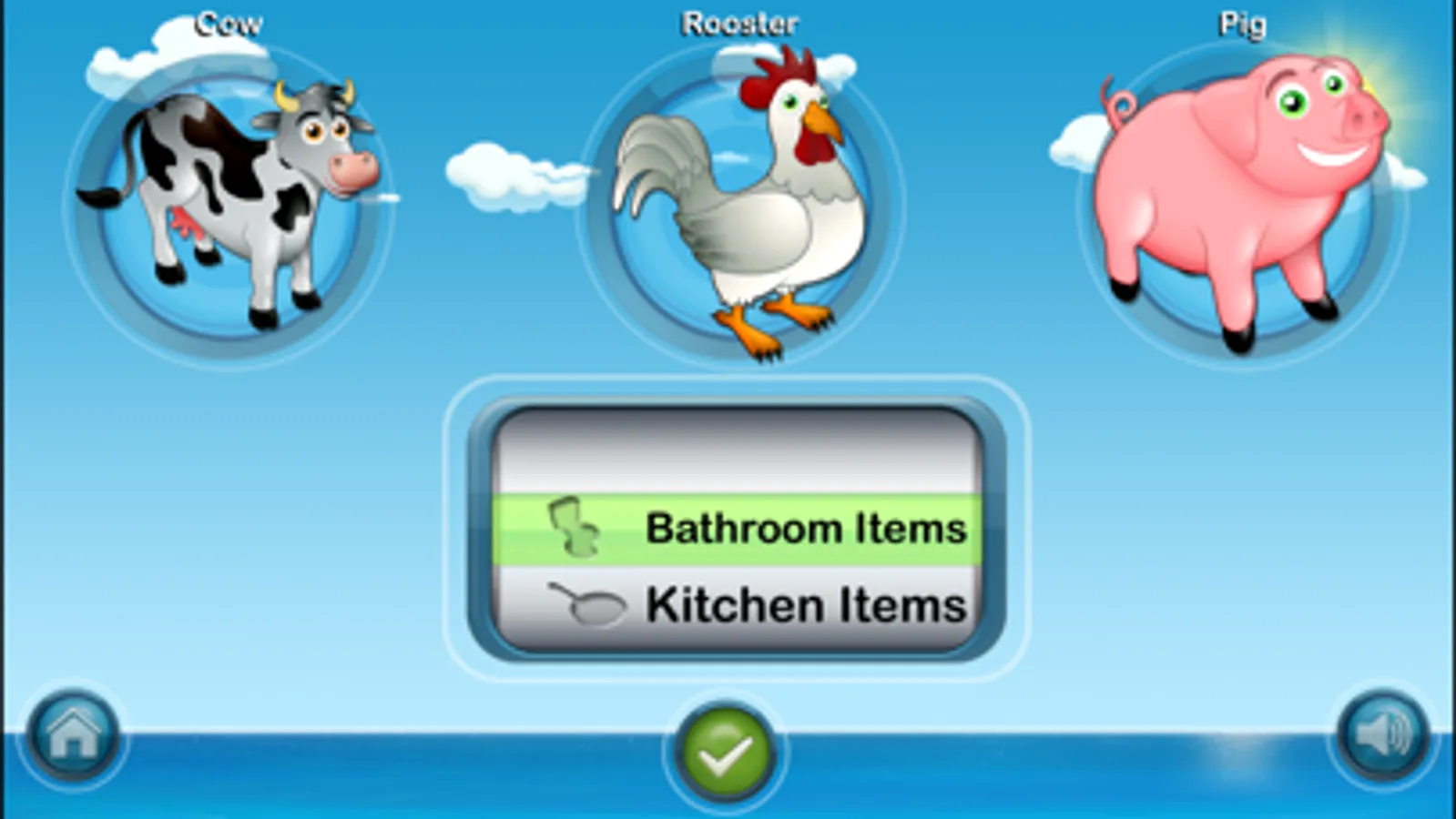 - Level One (Easy), A picture of an item is shown and the child has to identify the category that it belongs to among 5 selections.
