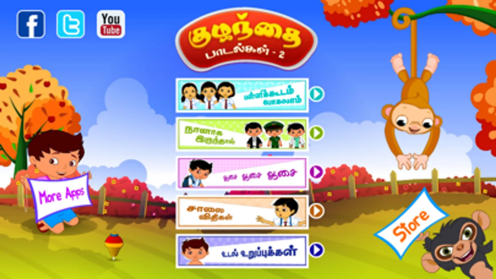 Tamizh Kids Rhymes (Tamizh Kuzhanthai Padalgal), A wonderful Nursery Rhymes app for your kids with songs, music, animations and sing-along. A fantastic app for kids featuring Five popular Nursery Rhymes.