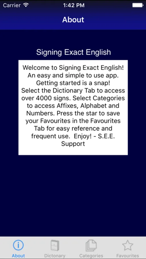 Learn to sign what you say! The only app available with Exact English Sign! S.E.E. is used by thousands of families, students and interpreters to enable the English language to become alive and visually accessible. Learn basic signs for communicating with babies, children, students and friends. Keep the Signing Exact English Dictionary at your fingertips for easy reference and a convenient way to expand your signing vocabulary.