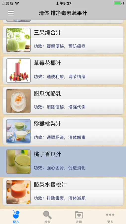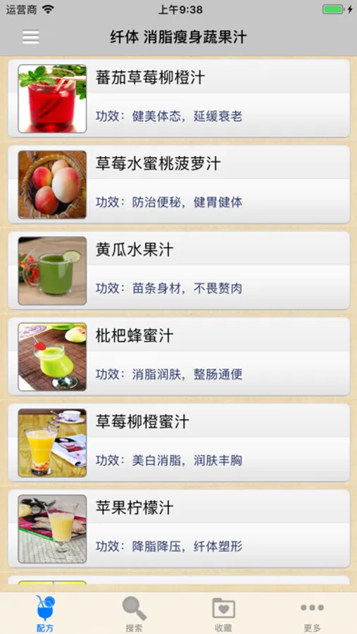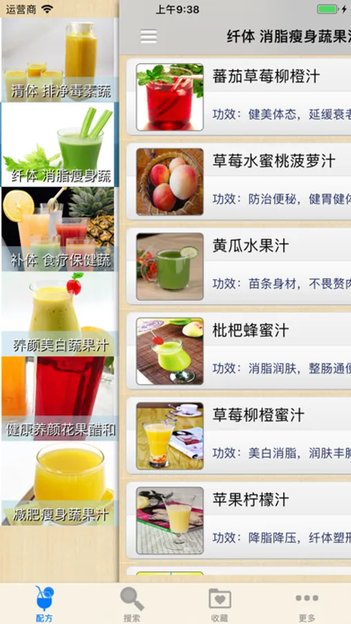 本软件囊括了200多道蔬果汁,满足不同用户的需要,分为清体排净毒素蔬果汁、纤体消脂瘦身蔬果汁、补体食疗保健蔬果汁、养颜美白蔬果汁、健康养颜花果醋和茶、减肥瘦身蔬果汁等,并包括制作方法,功效、材料、做法、小贴士等,更增加了食材的营养成分、功效、营养价值、适应人群等。让你轻松学会制作蔬果汁,了解食物的特性。天然果蔬最健康!