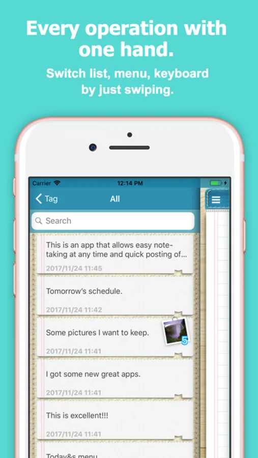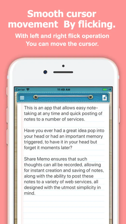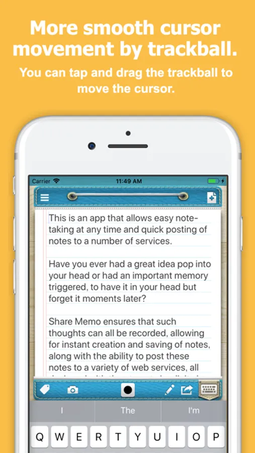 To simplify complicated text input on the iPhone, the app features swipe gestures to allow cursor movement, text selection, and menu movement, in addition to a trackball in the center of the screen, which allows for smooth cursor movement.