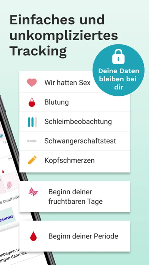 • Self-Tracking (Sex, Periode, Blutungen, Ergebnisse von Ovulations- und Schwangerschaftstests) auf täglicher Basis