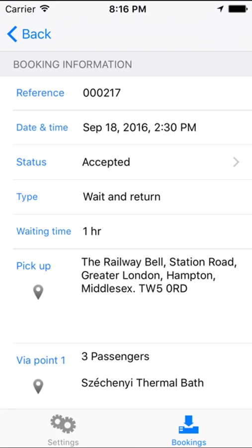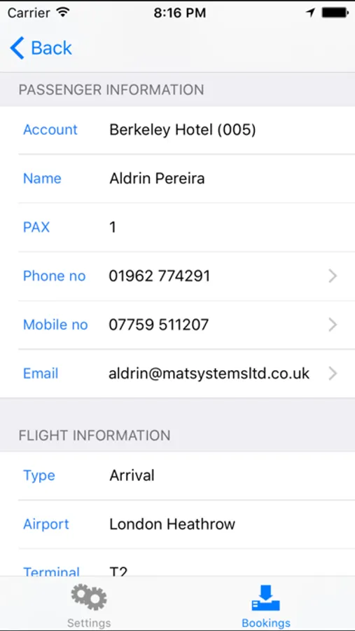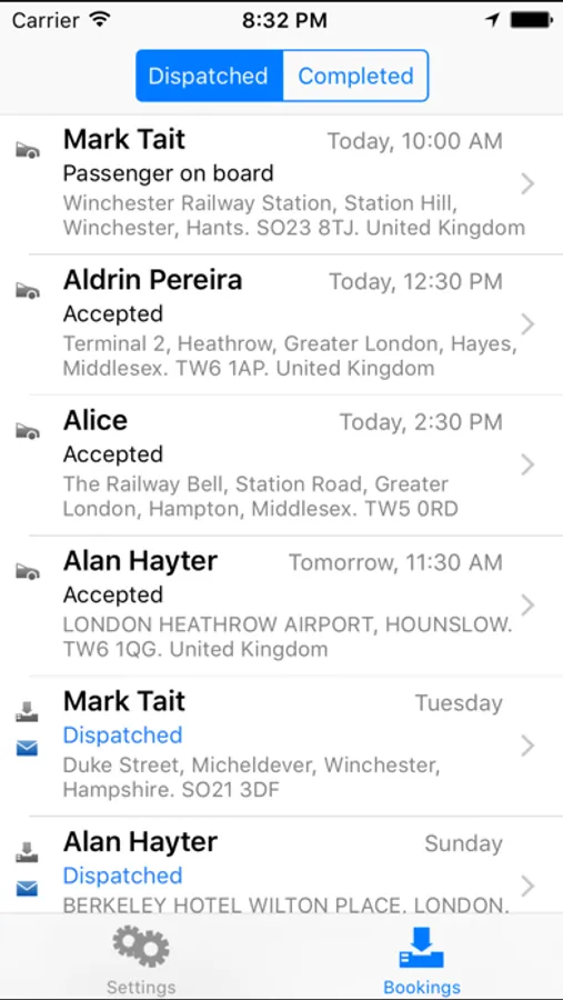 - Instantly receive dispatched bookings with full details of the passenger, flight information, collection time, pickup, via points and drop off locations, wait and return instructions and of any fare to collect