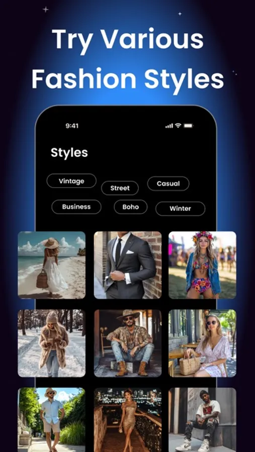 Choose from an array of stunning fashion styles, such as Vintage, Business, Street, Casual, and Bohemian. Harness our cutting-edge technology to craft your unique look with our outfit maker and style tuner. Enter your preferences and watch as your custom outfits come to life on your body with mesmerizing precision.