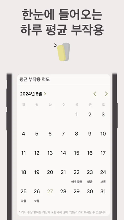 • 캘린더를 통해 하루 평균 부작용을 한눈에 확인할 수 있어요.