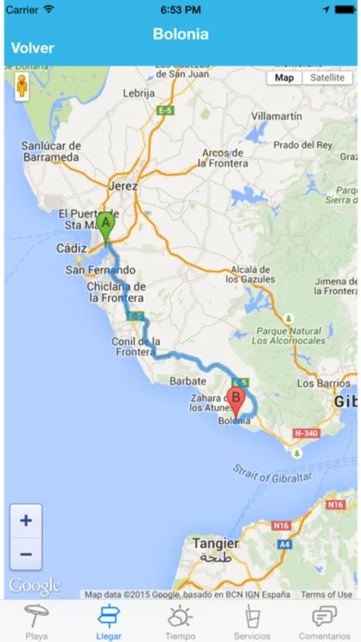 1) Playas cercanas, que mostrará un mapa con tu ubicación actual y podrás elegir que se muestren las playas en un radio de 10-50 kms.