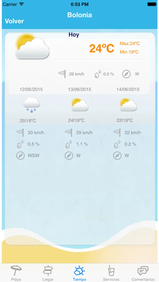 6) El tiempo actual (temperatura máx. y min., velocidad y dirección del viento) y la previsión para los tres días siguientes.
