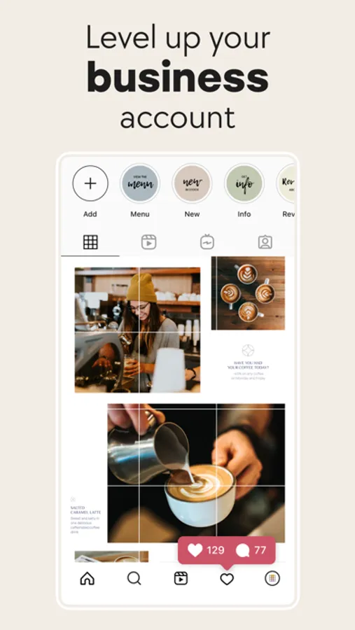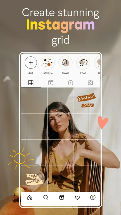 Add custom highlight covers to the stories you save. Use any of the suggested design sets or change images and text to create your own icons. With Grids your highlight covers will look fantastic!
