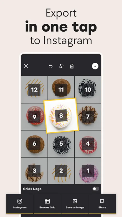 Sharing to Instagram is easy! Let Grids crop the image for you and submit the resulting pics to your Instagram in the order suggested by the app. You don't even have to save the tiles to your device as sharing to Instagram is embedded in the application!