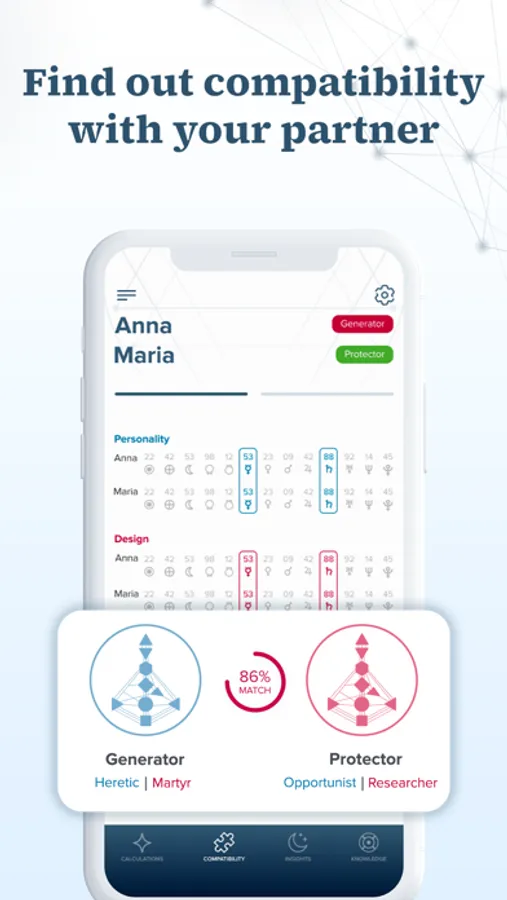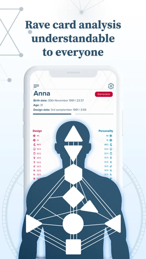 There are 5 main Types within Human Design. Find with genetic matrix and gene keys out your type and what talents and strengths you have, what skills you need to develop that will lead to success and a state of inner harmony, how to make the right decisions in life, what is the reason for failures, how to find the right partner. The bodygraph will tell you astrology compatibility, which periods in life will be difficult and, conversely, successful.